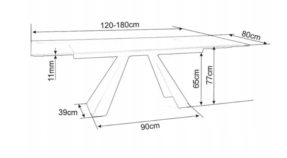 Matmenys : ilgis: 120 cm – plotis: 80 cm – aukštis: 76 cm –  išskleisto stalviršio ilgis: 180 cm .