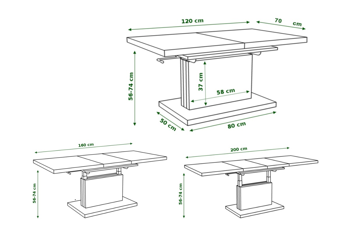 Matmenys : Ilgis: 120 cm – plotis: 70 cm – reguliuojamas aukštis: 56 – 74 cm – išskleistas ilgis: 160 cm arba 200 cm .